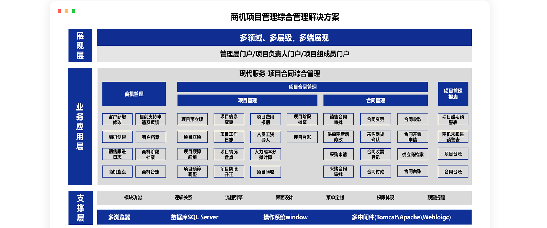 以项目管理为核心、从项目预立项到正式立项、项目工时统计、项目阶段升迁、到最终项目验收,在业务层面上实现了项目全生命周期的管理;从项目预算创建、项目支出管理、项目回款统计,以收支两条线为路径,从财务方面上实现了项目成本与收入的统计。